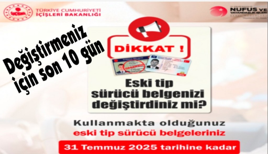 Birkaç kez uzatılan, eski tip sürücü belgelerinin yenilenmesi için belirlenen süre 31 Temmuz 2025 tarihinde sona eriyor. Yeni bir uzatma olmazsa bu tarihten sonra eski tip sürücü belgeleri geçersiz sayılacak.