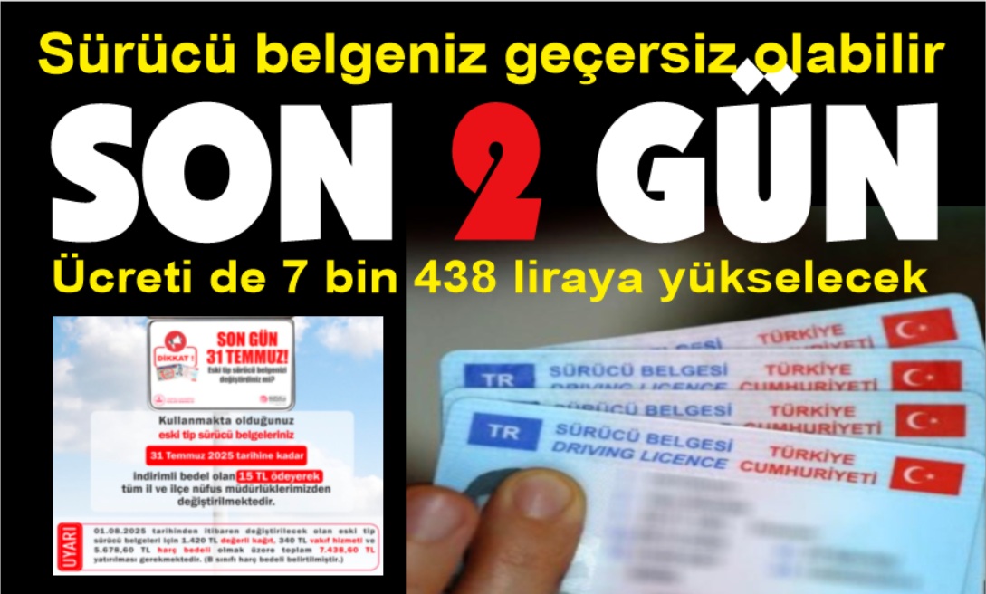 Eski tip sürücü belgesi kullanan 2 milyon 482 bin 461 kişi 31 Temmuz 2025'e kadar belgelerini yenilemediği takdirde sürücü belgeleri geçersiz sayılacak. Son 2 gün.