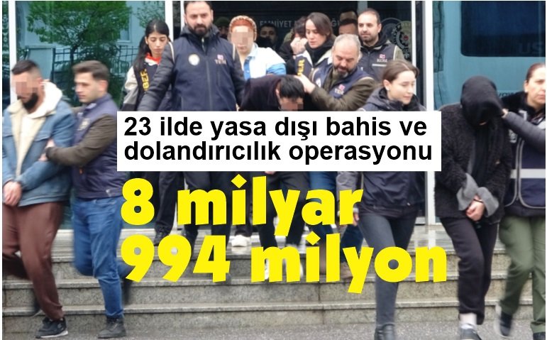 8 milyar 994 milyon 331 bin 260 TL işlem hacminin olduğu tespit edildi Trabzon merkezli 23 ilde yapılan yasa dışı bahis ve dolandırıcılık operasyonunda Trabzon'da gözaltına alınan 25 şüpheli şahıstan 16'sı serbest bırakıldı, 6'sına yurt dışı çıkış yasağı getirildi, 3'ü ise tutuklanarak cezaevine gönderildi