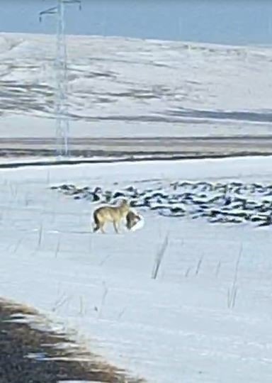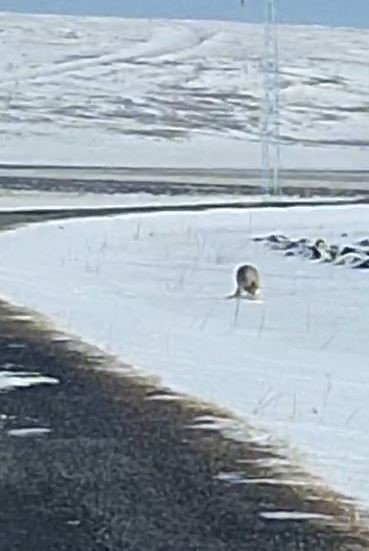Çetin kış şartlarından dolayı yiyecek bulmakta zorlanan yalnız kurt, Ardahan’a bağlı Küçük Sütlüce köyü yakınlarında leşi kapıp uzaklaşırken görüntülendi