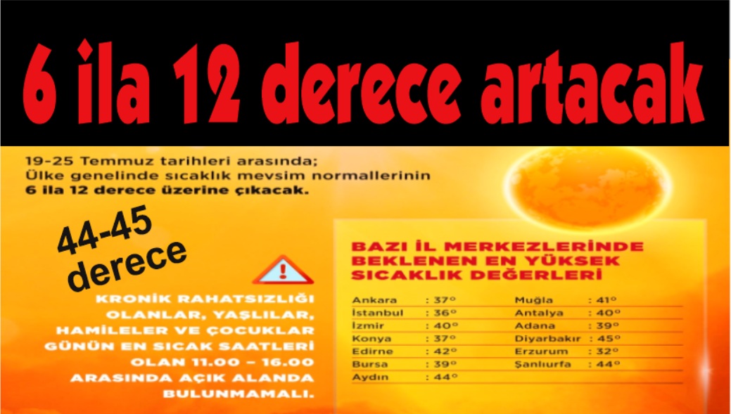 Çevre, Şehircilik ve İklim Değişikliği Bakanlığı Meteoroloji Genel Müdürlüğü verilerine göre mevsim normalleri üzerinde seyreden hava sıcaklıklarının 19 Temmuz Cumartesi gününden itibaren batı kesimlerden başlayarak ülke genelinde artması bekleniyor. 19-25 Temmuz tarihleri arasında ülke genelinde sıcaklığın mevsim normallerinin 6-12 derece üzerine çıkacağı tahmin ediliyor. Bu tarihler arasında bazı il merkezlerinde beklenen en yüksek hava sıcaklıkları şöyle olacak: