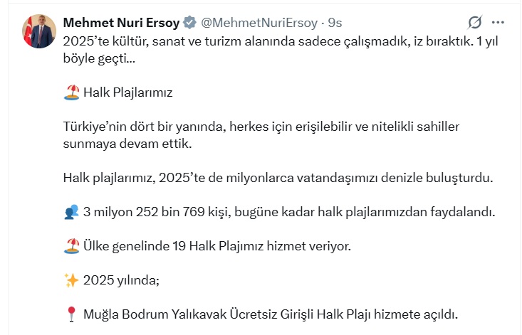 Kültür ve Turizm Bakanı Mehmet Nuri Ersoy sosyal medyadan yaptığı paylaşımda; “2025’te kültür, sanat ve turizm alanında sadece çalışmadık, iz bıraktık. 1 yıl böyle geçti…