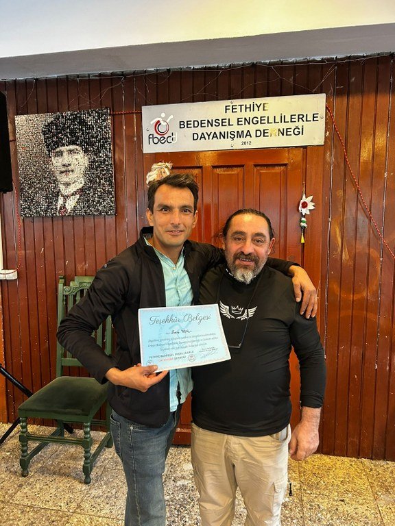 Fethiye Bedensel Engellilerle Dayanışma Derneği Başkanı Cemal Akbuğa; derneğe destek olan kişilere ve kurum temsilcilerine teşekkür belgelerini takdim ediyor.