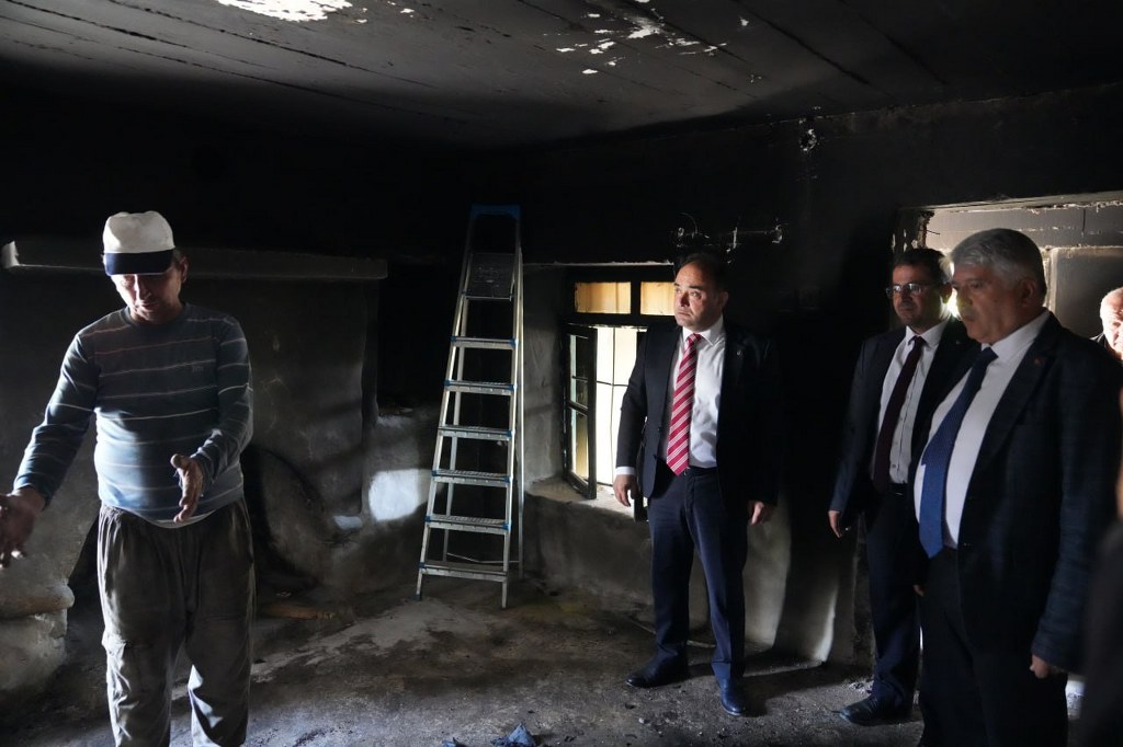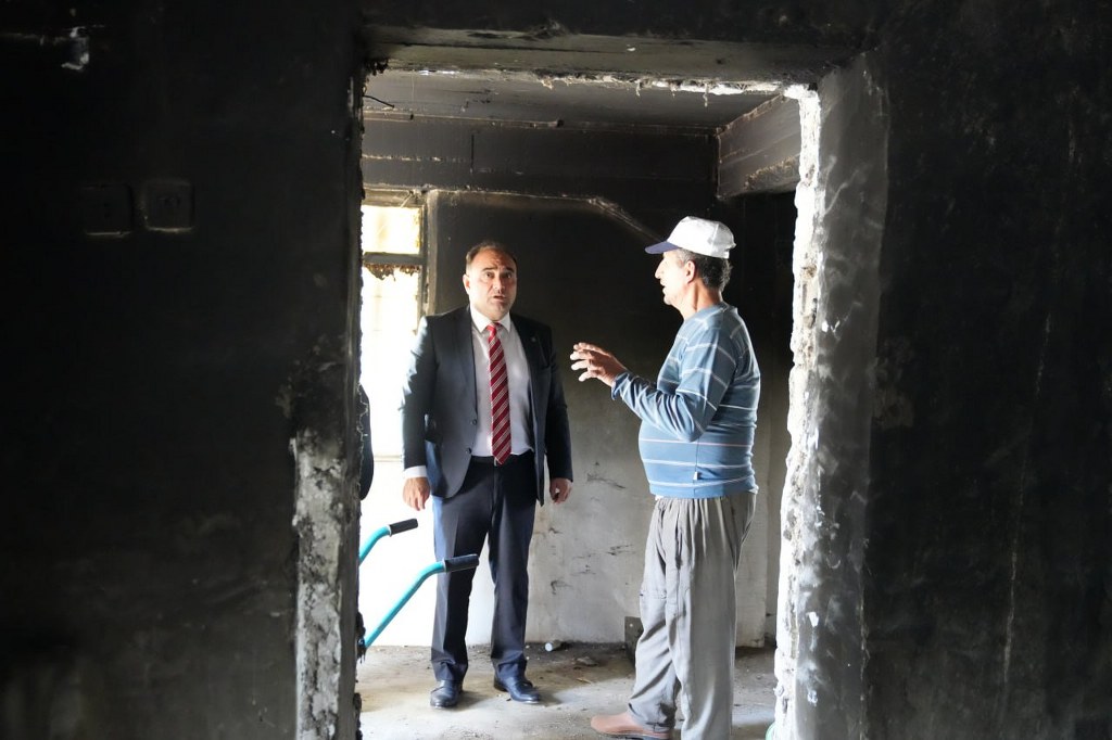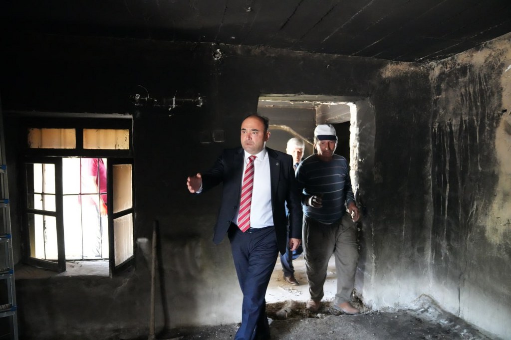 Beraberinde AK Parti İlçe Başkanı Ali Büklü ve MHP İlçe Başkanı Mehmet Arıç ile birlikte yangınzede aileyi ziyaret eden başkan Akdenizli, elektrik kontağından çıktığı tahmin edilen yangın sonrası kullanılamaz hale gelen evde incelemelerde bulundu.