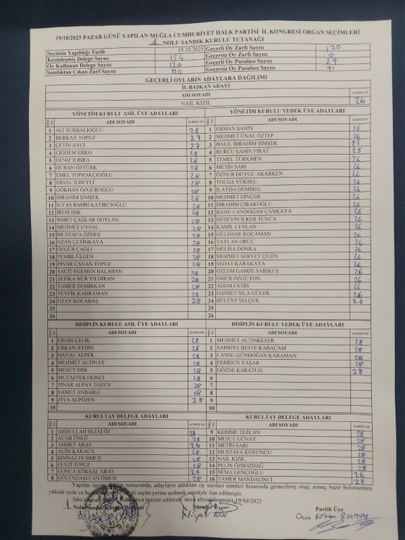 CHP’nin Muğla genelinde toplam 635 delegesi bulunuyor. Kongrede 515 delege oy kullandı. Bazı delegeler oy kullanmadan ayrıldı. Kızıl’ın listesi 329 oy aldı. Ancak özellikle birinci sandıktan çıkan sonuçlar, parti içindeki huzursuzluğun işareti olarak görüldü.