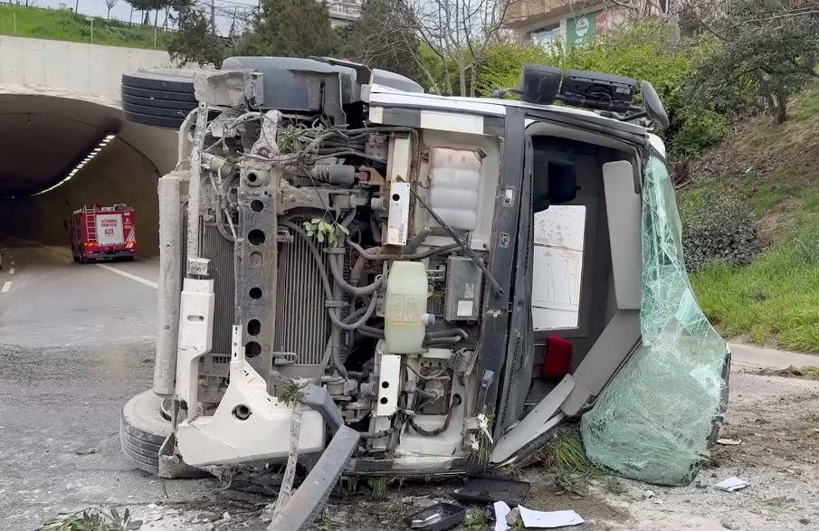Ümraniye'de otoyolda devrilen beton mikserinin sürücüsü, sıkıştığı yerden kurtarılarak hastaneye kaldırıldı.
