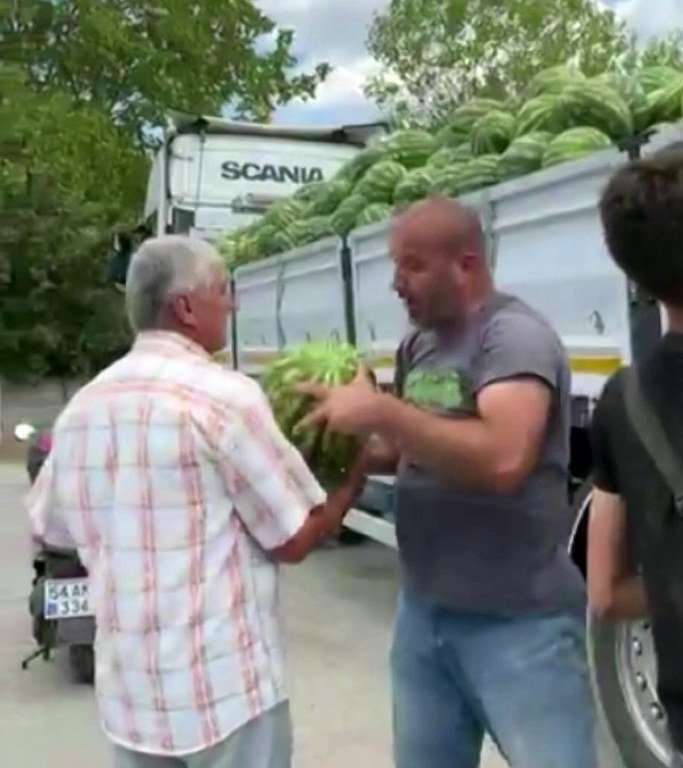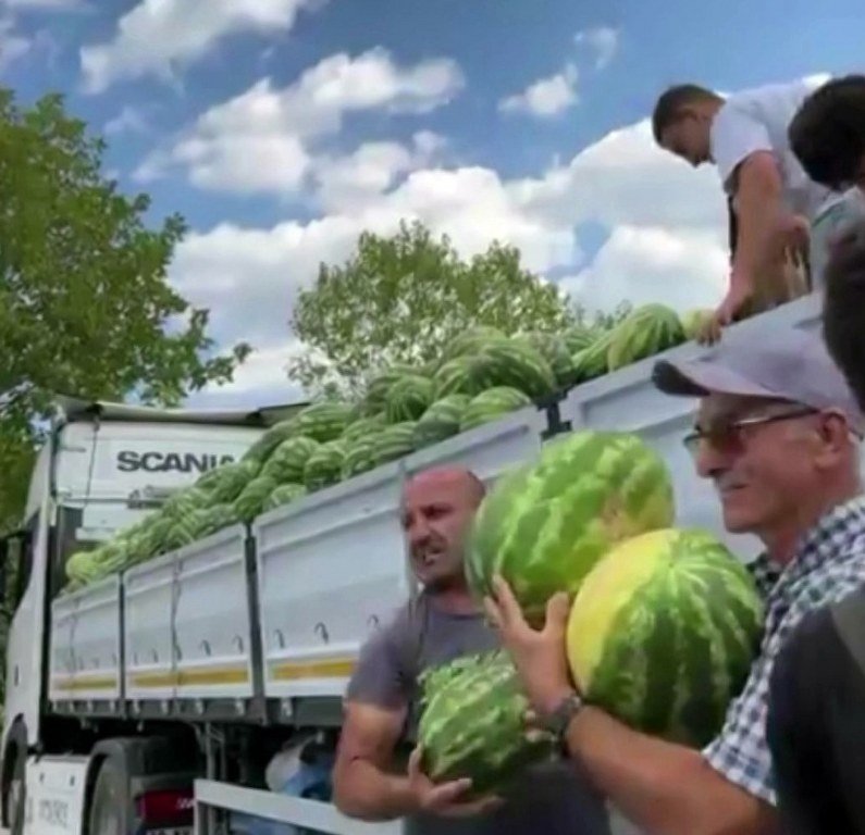 Sakarya'nın Hendek ilçesinde tarım şirketi tarafından, vatandaşlara bir tır dolusu karpuz ücretsiz şekilde dağıtıldı.