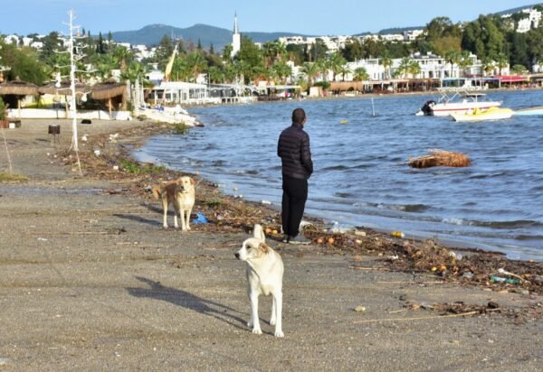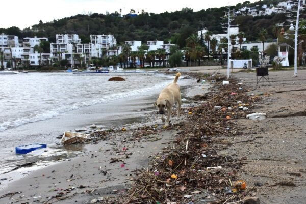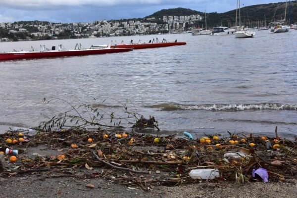 Bodrum'da yağmur suyuyla denize sürüklenen atıklar kıyıya vurdu