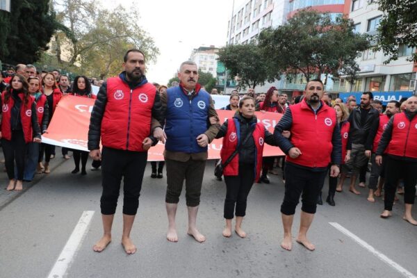 İzmir Büyükşehir Belediyesi şirketlerinde çalışan işçiler, aylardır ödenmeyen hakları ve işten çıkarmalara tepki göstermek amacıyla sendika binasından Kültürpark'a kadar çıplak ayakla yürüdü. DİSK Genel-İş İzmir 2 No'lu Şube Başkanı Ercan Gül, "İzmir Büyükşehir Belediyesi Başkanı Cemil Tugay'ın ‘Sendikalar agresif davranıyor, aylardır eylem yapmadıkları için kendilerini hatırlatmak istiyorlar.' şeklindeki açıklamaları gerçeği yansıtmamaktadır. Biz kendimizi hatırlatmak için değil, üyelerimizin dört aydır ödenmeyen hakları ve havuzda bekletilen arkadaşlarımızın çilesi için buradayız" dedi.