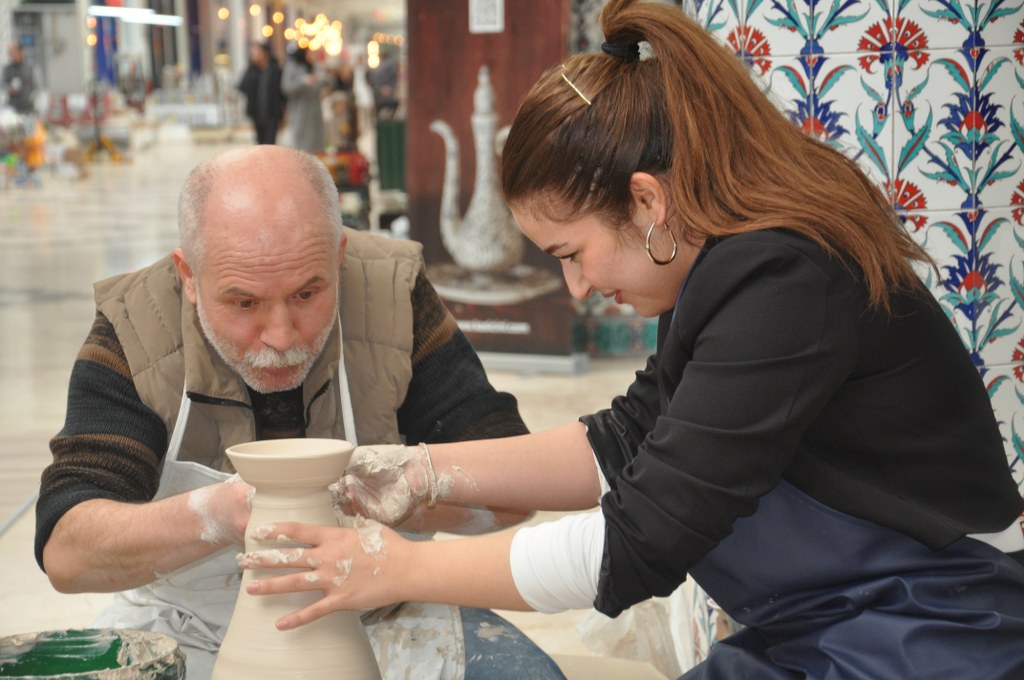 Çarşı içerisinde oluşturulan alanda çark ustası çininin çamurdan yapım aşamasını yaptığı objelerle gösteriyor.