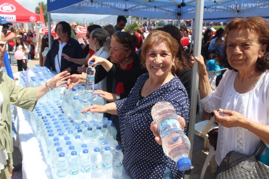 Fethiye’de yardımsever kadınlarından oluşan Gönüllüler grubu Beşkaza Meydanı’nda 1000 şişe su dağıttılar.
