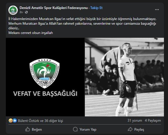İhbar üzerine olay yerine gelen ekipler çilingir yardımıyla girdikleri evde Muratcan Ilgaz’ı hareketsiz halde buldu. Sağlık ekipleri tarafından yapılan incelemede Ilgaz’ın yaşamını yitirdiği belirlendi. Hakem Ilgaz’ın vefatı, Denizli’nin spor camiasında üzüntüye neden oldu. Hakem arkadaşları ve spor kulüpleri, sosyal medya hesaplarından başsağlığı mesajları paylaşarak Ilgaz’ı andı.[/caption]
