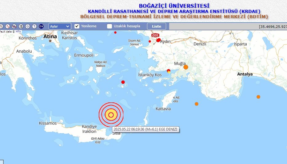 Depremin Ege Denizi Girit Adası yakınlarında olduğu belirtildi. Boğaziçi Üniversitesi Kandilli Rasathanesi verilerinden alınan bilgiye göre depremin büyüklüğü 6.1, AFAD ise 6.0 olarak güncelledi.