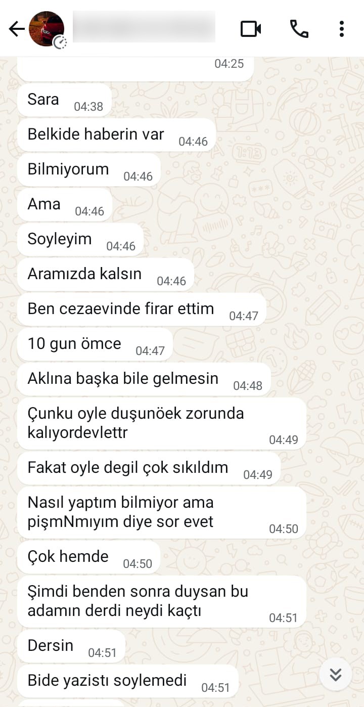 Geçtiğimiz günlerde ise Serkan T., cezaevinden firar edip genç kadına, ‘Affına sığınıyorum, otel camından dışarı bakıyorum ve acaba Sara beni polise mi verecek diye düşünüyorum' diyerek mesajlar atmaya başladı. Öte yandan Serkan T., gönderdiği bir sesli mesajında genç kadına, ‘İstersen Suriye'ye git, o askerleri, telleri geçer yine gelirim, sana güveniyorum' demesi pes dedirtti.