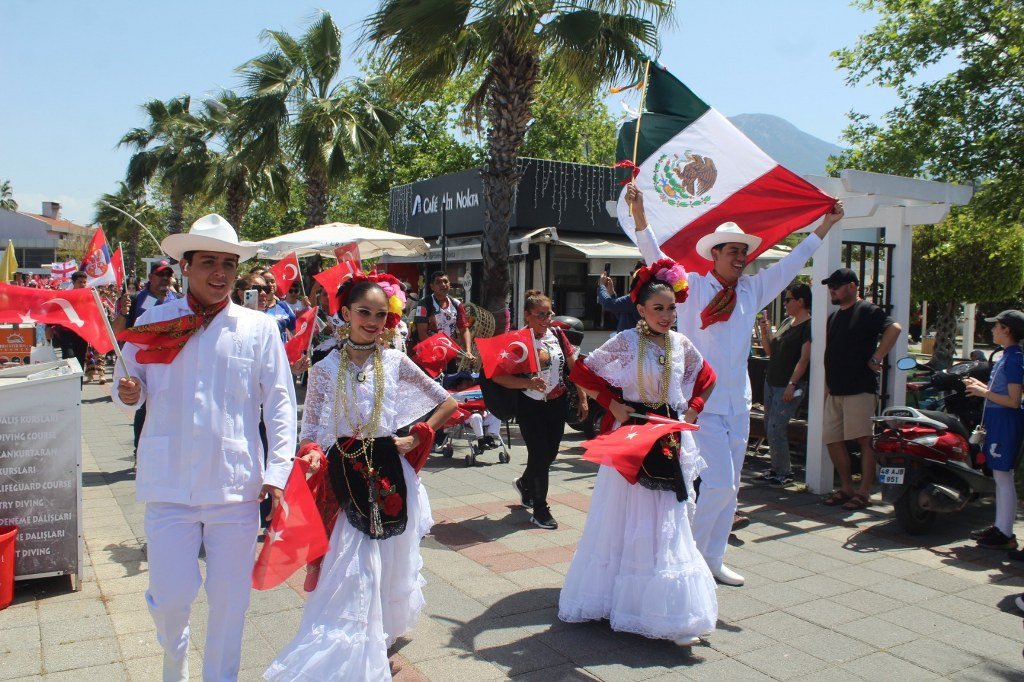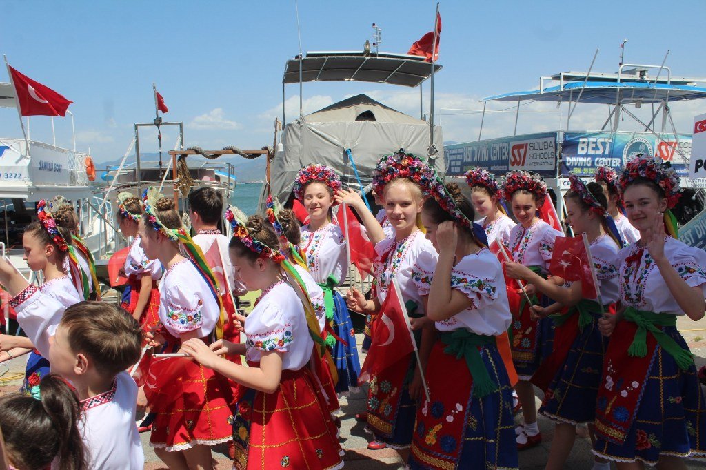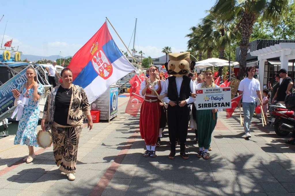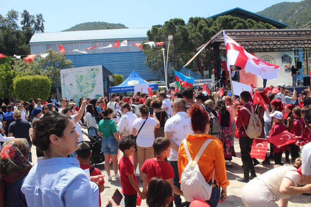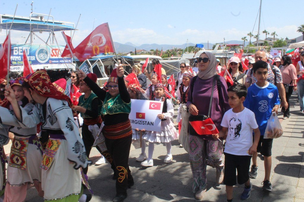 Beşkaza meydanında Fethiye Belediyesi ve sivil toplum kuruluşları tarafından açılan stantlarda çocuklar için çeşitli eğlenceler düzenlendi ve armağanlar verildi. Kortej yürüyüşüne ve 23 Nisan Çocuk şenliğine katılan dünya çocukları halk oyunları oynadılar ve gösterilerde bulundular. Yoğun katılımın olduğu çocuk şenliği gün boyu sürdü. Kortej yürüyüşüne ve çocuk şenliğine katılan Türkiye, Azerbaycan, Kırgızistan, Bulgaristan, Gürcistan, Meksika, Moldova, Litvanya, Sırbistan, Polonya ve Ukrayna’dan gelen çocukların ve ekiplerin gösterileri büyük bir ilgiyle izlendi. 23 Nisan Bayramını kutlayan dünya çocukları ellerinde Türk bayraklarıyla “Türkiye” sloganları attılar. Coşkulu bir şekilde Beşkaza meydanında gerçekleştirilen çocuk şenliği kortej yürüyüşü ile başladı. Fethiye Kaymakamlığı öncülüğünde İlçe Milli Eğitim Müdürlüğü tarafından düzenlenen 23 Nisan Kortej yürüyüşü sahil bandındaki DSİ Binası önünden başladı. Kortej yürüyüşü ve Beşkaza Meydanındaki şölene Fethiye Kaymakamı İsmail Hakkı Ertaş, İlçe Milli Eğitim Müdürü Faruk Kaya, STK başkan ve üyeleri ile öğretmenler, öğrenciler ve vatandaşlar katıldı. Belediye bandosu eşliğinde dev Türk Bayrağı ve Atatürk posteri ile yürüyen çocuklar 23 Nisan coşkusunu doyasıya yaşadılar. Kendi ülkelerinin kıyafetleri içerisinde dans ederek yürüyen yabancı halk oyunları grupları ve yürüyüşe katılanlar kordon boyunda kafelerde bulunan vatandaşlar tarafından sık sık alkışlandı. Beşkaza Meydanı’nda başta Kızılay İyilik Platformu olmak üzere STK’lar çocuklara değişik etkinlikler sunarken, ikramlarda da bulundular. Beşkaza Meydanı’nda yapılan 23 Nisan Ulusal Egemenlik ve Çocuk Bayramı programında belediye bandosu eşliğinde Cumhuriyetimizin kurucusu Gazi Mustafa Kemal Atatürk ve tüm şehitlerimiz için 1 dakikalık saygı duruşunda bulunulup, İstiklal Marşımız söylendi. Ardından Türkiye, Azerbaycan, Gürcistan, Meksika, Moldova, Litvanya, Sırbistan, Polonya ve Ukrayna’dan halk oyunları grupları birer gösteri yaparak büyük alkış topladı. 16. Uluslararası Altın Güneş Fethiye Çocuk Festivali için Fethiye’de bulunan 9 ülkeden halk oyunları gruplarının gösterilerini vatandaşlar cep telefonlarıyla görüntülemek için adeta birbirleriyle yarıştılar. Haber/Foto-Gökhan Ayyıldız