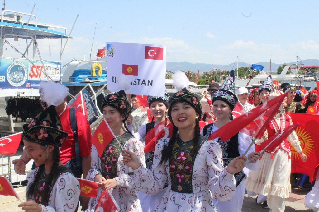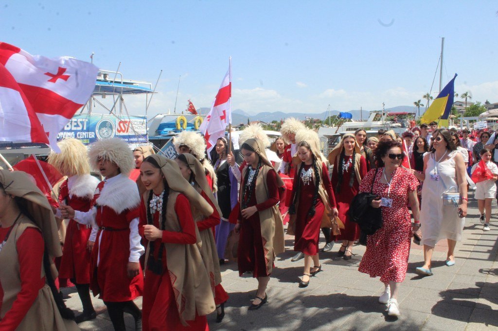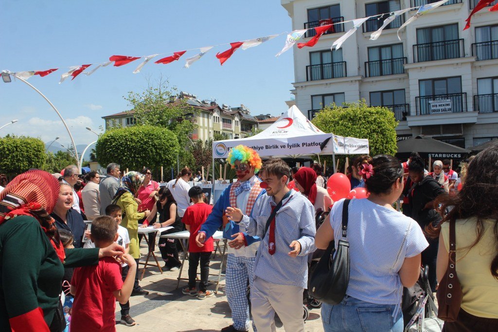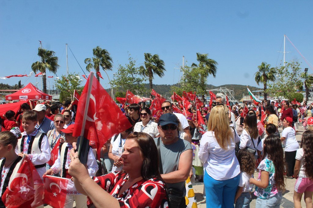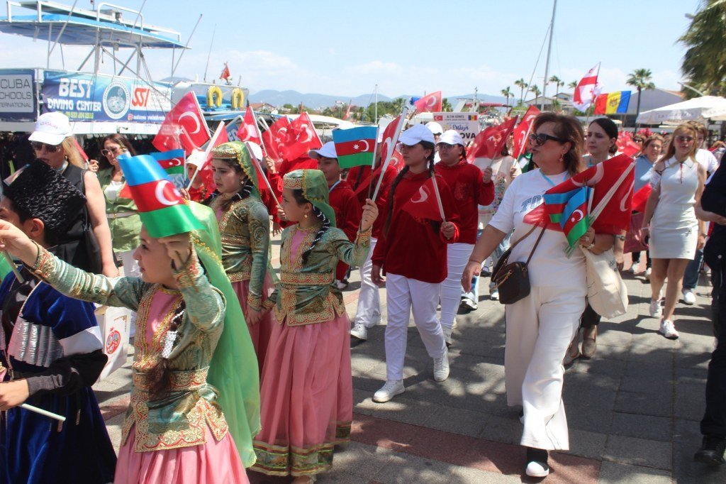 Beşkaza meydanında Fethiye Belediyesi ve sivil toplum kuruluşları tarafından açılan stantlarda çocuklar için çeşitli eğlenceler düzenlendi ve armağanlar verildi. Kortej yürüyüşüne ve 23 Nisan Çocuk şenliğine katılan dünya çocukları halk oyunları oynadılar ve gösterilerde bulundular. Yoğun katılımın olduğu çocuk şenliği gün boyu sürdü. Kortej yürüyüşüne ve çocuk şenliğine katılan Türkiye, Azerbaycan, Kırgızistan, Bulgaristan, Gürcistan, Meksika, Moldova, Litvanya, Sırbistan, Polonya ve Ukrayna’dan gelen çocukların ve ekiplerin gösterileri büyük bir ilgiyle izlendi. 23 Nisan Bayramını kutlayan dünya çocukları ellerinde Türk bayraklarıyla “Türkiye” sloganları attılar. Coşkulu bir şekilde Beşkaza meydanında gerçekleştirilen çocuk şenliği kortej yürüyüşü ile başladı. Fethiye Kaymakamlığı öncülüğünde İlçe Milli Eğitim Müdürlüğü tarafından düzenlenen 23 Nisan Kortej yürüyüşü sahil bandındaki DSİ Binası önünden başladı. Kortej yürüyüşü ve Beşkaza Meydanındaki şölene Fethiye Kaymakamı İsmail Hakkı Ertaş, İlçe Milli Eğitim Müdürü Faruk Kaya, STK başkan ve üyeleri ile öğretmenler, öğrenciler ve vatandaşlar katıldı. Belediye bandosu eşliğinde dev Türk Bayrağı ve Atatürk posteri ile yürüyen çocuklar 23 Nisan coşkusunu doyasıya yaşadılar. Kendi ülkelerinin kıyafetleri içerisinde dans ederek yürüyen yabancı halk oyunları grupları ve yürüyüşe katılanlar kordon boyunda kafelerde bulunan vatandaşlar tarafından sık sık alkışlandı. Beşkaza Meydanı’nda başta Kızılay İyilik Platformu olmak üzere STK’lar çocuklara değişik etkinlikler sunarken, ikramlarda da bulundular. Beşkaza Meydanı’nda yapılan 23 Nisan Ulusal Egemenlik ve Çocuk Bayramı programında belediye bandosu eşliğinde Cumhuriyetimizin kurucusu Gazi Mustafa Kemal Atatürk ve tüm şehitlerimiz için 1 dakikalık saygı duruşunda bulunulup, İstiklal Marşımız söylendi. Ardından Türkiye, Azerbaycan, Gürcistan, Meksika, Moldova, Litvanya, Sırbistan, Polonya ve Ukrayna’dan halk oyunları grupları birer gösteri yaparak büyük alkış topladı. 16. Uluslararası Altın Güneş Fethiye Çocuk Festivali için Fethiye’de bulunan 9 ülkeden halk oyunları gruplarının gösterilerini vatandaşlar cep telefonlarıyla görüntülemek için adeta birbirleriyle yarıştılar. Haber/Foto-Gökhan Ayyıldız