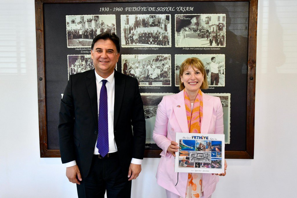 Birleşik Krallık Türkiye Büyükelçisi Jill Morris ve beraberindeki diplomatik heyeti Fethiye Belediye Başkanı Alim Karaca'yı makamında ziyaret etmişti.