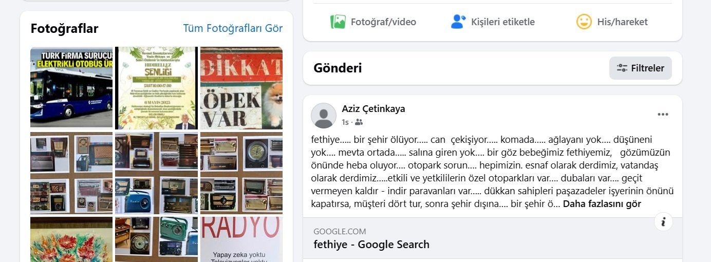 Aziz Çetinkaya'nın sosyal medyadan Fethiye ile ilgili yaptığı feryat şöyle: "Fethiye….. bir şehir ölüyor….. can çekişiyor….. komada….. ağlayanı yok…. düşüneni yok…. mevta ortada….. salına giren yok…. bir göz bebeğimiz fethiyemiz, gözümüzün önünde heba oluyor…. otopark sorun…. hepimizin. esnaf olarak derdimiz, vatandaş olarak derdimiz…..etkili ve yetkililerin özel otoparkları var…. dubaları var…. geçit vermeyen kaldır - indir paravanları var….. dükkan sahipleri paşazadeler işyerinin önünü kapatırsa, müşteri dört tur, sonra şehir dışına…. bir şehir ölüyor… bir fethiye can çekişiyor…. yanık yanık sela okunuyor…. fethiye ölüyor"