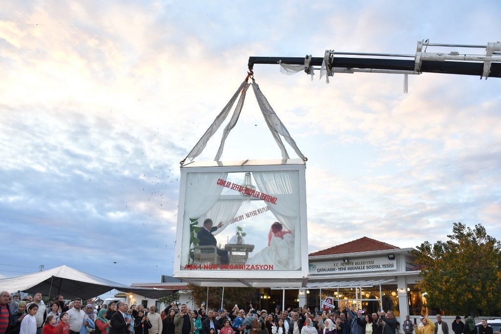 Fethiye ve Seydikemer ilçelerinin siyaset, esnaf ve ticaret dünyasından yoğun katılımın olduğu düğün töreninde gelin almaya özel yaptırılıp tıra yüklenen cam vitrin ile gidildi. Cam vitrin kız evinde vinçle tırdan indirilirken, gelin Merve Sarıman ve damat Berat Çetinkaya dualarla cam vitrine girdi. Cam vitrin vinçle tekrar tıra alkışlar arasında yüklendi. Gelini alan damat tarafları konvoy eşliğinde Seydikemer ilçesinden Fethiye'ye hareket etti. Tırda gelin ve damadı cam vitrinde görenler bu anı cep telefonlarıyla görüntülemeye çalıştı. Tır üzerinde cam vitrin içinde Çatalarık Mahallesi sosyal tesislerine çift geldiğinde çok sayıda davetli alkış tuttu. Cam vitrin içindeki çift burada da vinç yardımıyla tırdan yine alkışlar arasında indirildi.