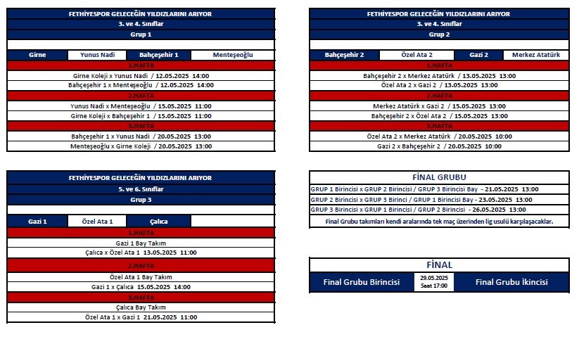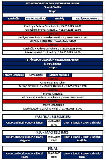 Turnuva; saat 13:00’te Fethiye Kaymakamı İsmail Hakkı Ertaş tarafından başlama vuruşu ie start alacak. 2025 Yılı 1.Geleneksel Fethiyespor Geleceğin Yıldızlarını Arıyor Kaymakamlık Futbol Turnuvası’nda maçlar deplasmanı lig usulü ile oynanacak. Final müsabakaları ise 29 Mayıs Perşembe oynanacak.