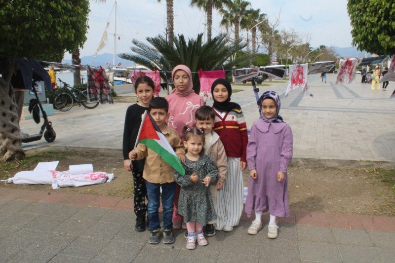 Anadolu Gençlik Derneği (AGD) ile Milli Gençlik Vakfı Fethiye temsilcilikleri tarafından düzenlenen “Zalime Lanet Mazluma Dua” adlı protesto gösterisinde; Filistin ve İran'da ölen çocukların giydiğielbiseleri temsilen kanlı elbiseler ile kanlı kefenler bırakıldı.