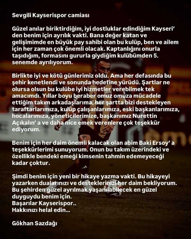 Kayserispor’dan Beşiktaş’a transfer olan kaptan Gökhan Sazdağı hem Kayseri şehrine hem de Kayserispor’a veda etti.