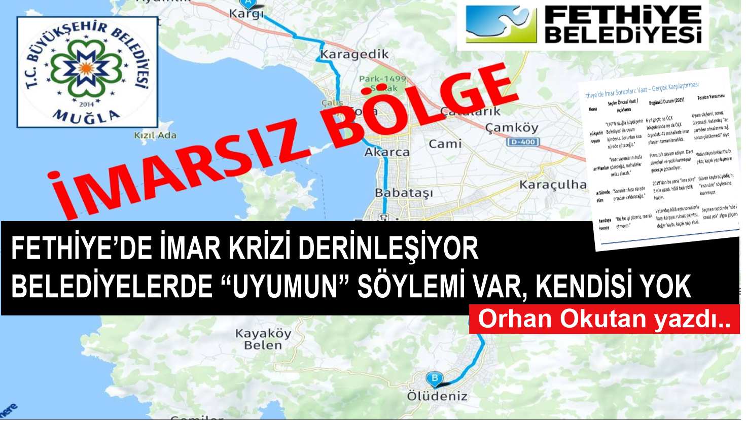 Seçimlerden önce Fethiye Belediye Başkanı Alim Karaca, Muğla Büyükşehir Belediyesi ile uyum içinde çalışacağını, sorunların kısa sürede çözüleceğini vaat etmişti. Gelinen noktada ise koca bir hayal kırıklığı var. Ne Büyükşehir Belediye Başkanı Ahmet Aras ne de Alim Karaca, imar planları konusunda tatmin edici tek bir açıklama yapabiliyor. “Uyum” söylemi var ama kendisi ortada yok.