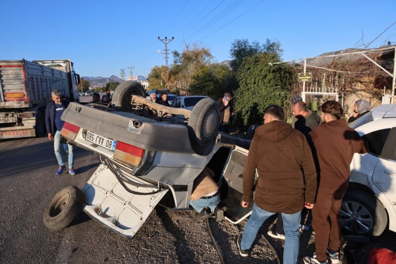 Adana’da Kozan-Kadirli yolunda hatalı sollama yaptığı iddia edilen otomobilin takla atması sonucu meydana gelen kazada 2 kişi ağır yaralandı. Kaza anı güvenlik kamerasına yansıdı.