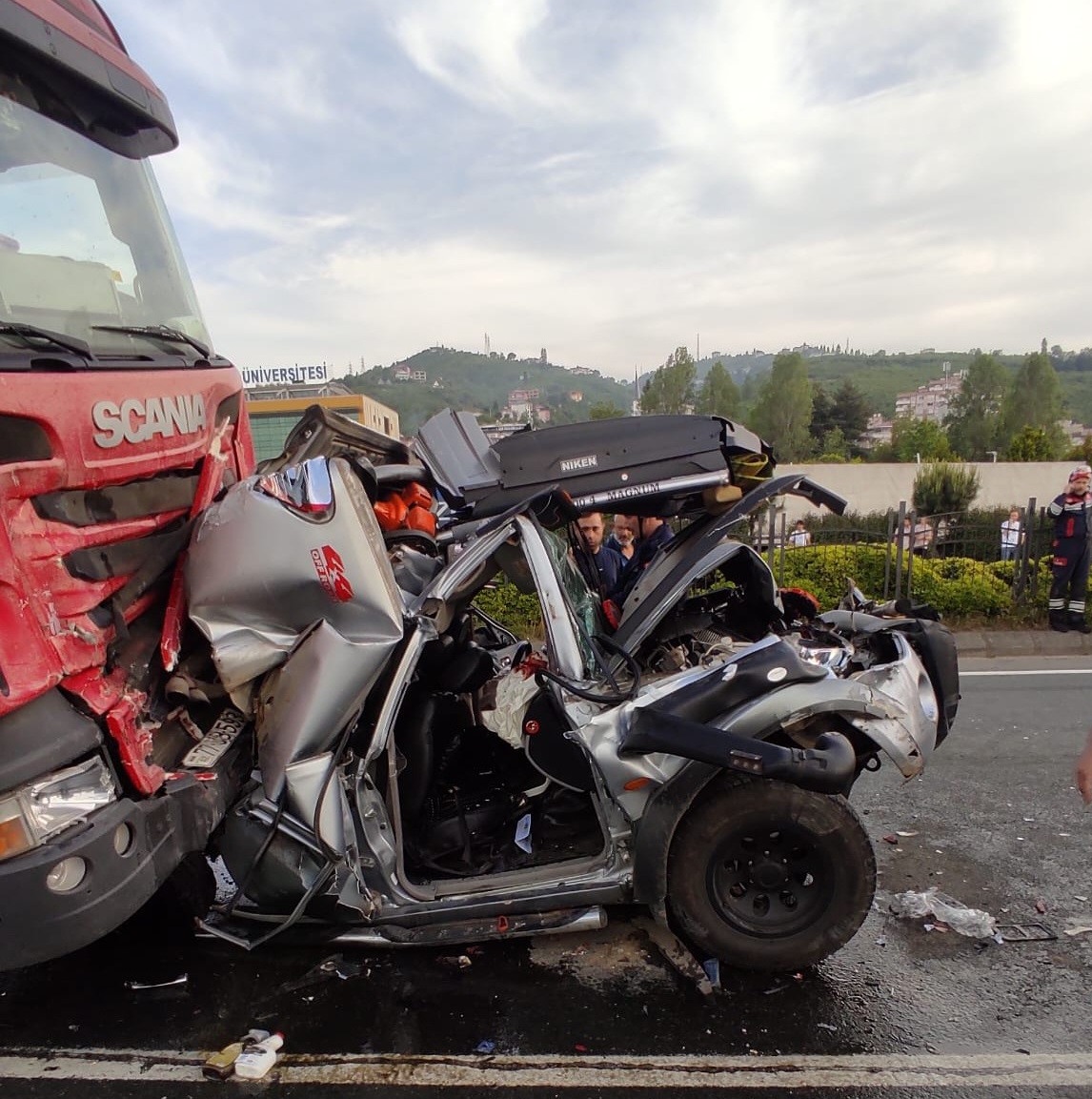 Trabzon'un Yomra ilçesinde Rize'den Trabzon istikametine meydana gelen trafik kazasında, iki TIR arasında sıkışan bir araç hurdaya döndü. Araçta sıkışan yaralıların kurtarılması için Trabzon Büyükşehir Belediyesi İtfaiye Dairesi Başkanlığı ekipleri teyakkuza geçti. Hızla kaza yerine ulaşan itfaiyeciler, adeta demir yığınına dönen araçta sıkışan 3 vatandaşı bulundukları yerden çıkardı. Yaralı vatandaşlar, olay yerinde sağlık ekiplerinin yaptığı ilk müdahalenin ardından ambulanslarla hastaneye kaldırıldı. (İHA)