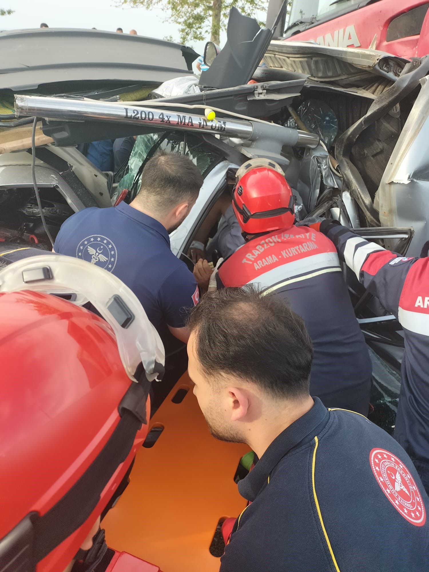 İki tır arasında kalarak hurdaya dönen araçta sıkışan 3 kişiyi bulunduklqrı yerden çıkarmak için Trabzon Büyükşehir Belediyesi'ne bağlı itfaiye ekipleri yoğun çaba harcadı.