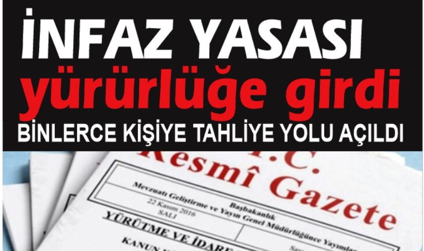 İnfaz düzenlemesi Resmi Gazete'de yayımlanarak yürürlüğe girdi. Yasayla birlikte yaklaşık 20 bin mahkumun cezaevinden tahliye edilmesinin önü açıldı. Birkaç gün içinde çok sayıda mahkumun salıverilebileceği belirtiliyor.
