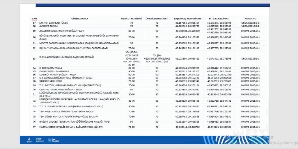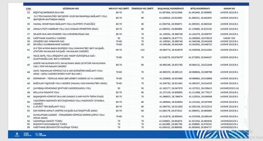 D100 Karayolu Büyükçekmece TÜYAP ile Altunizade Köprülü Kavşağı arasında saatte 80 kilometre olan hız limiti 90 kilometreye çıkarıldı. Beşiktaş Barbaros Bulvarı'nda maksimum hız limiti ise saatte 70 kilometre olarak değişirken, Hasdal-Okmeydanı Bağlantı Yolu'nun yeni hız limiti saatte 90 kilometre, O-3 TEM Ayrımı-Basın Ekspress Yolu'ndaki yeni limit saatte 100 kilometre olarak güncellendi. 4. Levent-TEM Bağlantı Yolu'nun yeni hız sınırı saatte 90 kilometre olurken, O3 Tem Ayrımı - Basın Ekspress yolu - (Mahmutbey Batı Kavşağı- Atatürk Havaalanı Kavşağı - Havaalanı Caddesi) saatte 110 kilometreye çıkarıldı. D100 Harem - Tuzla arası saatte 90 kilometreye, Söğütlüçeşme Köprülü Kavşağı - Uzunçayır Köprülü Kavşağı Arası saatte 90 kilometreye çıkarıldı. Bolluca - İhsaniye Yolu, Tantavi, Vecdi Diker ve Halit Ulukurt Tüneli ise saatte 90 kilometreye çıkarıldı. Kağıthane Anadolu Caddesi saatte 50 kilometreden 70 kilometre, Arnavutköy - Habipler Yolu (Sultangazi - Fenertepe Arası), Hal Otogar Bağlantı Yolu ve Haramidere Bağlantı yolu saatte 90 kilometre olarak güncellendi.