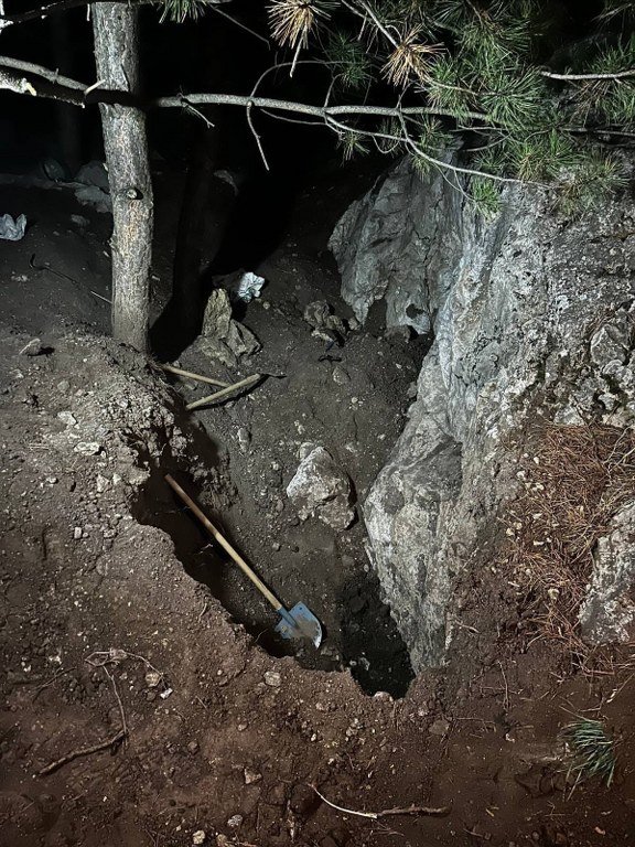 Şüphelilerin yanlarında 2 adet Kürek, Kazma, Çapa, Balyoz, Manila, Kafa lambası, El feneri ele geçirildi.