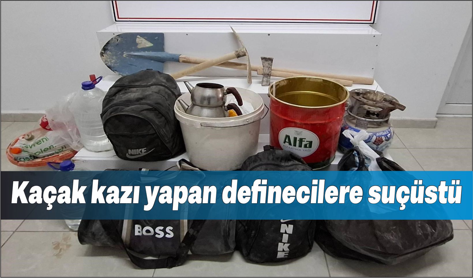Kazı alanında yapılan incelemede; bel küreği, kazma, çapa ve çeşitli kazı malzemeleri ele geçirildi. Ele geçirilen malzemelere el konulurken, gözaltına alınan şahıslarla ilgili adli süreç başlatıldı./İHA