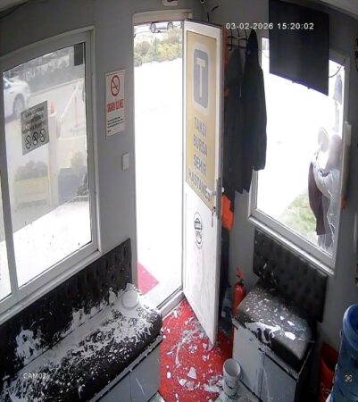 Bursa Şehir Hastanesi taksi durağında yaşanan saldırının güvenlik kamerası görüntüleri dehşete düşürdü. Taksiye alınmadığı gerekçesiyle sinir krizi geçirdiği öne sürülen sağlık çalışanı durağı adeta savaş alanına çevirdi. Olayda yaklaşık 150 bin liralık maddi hasar meydana geldi.