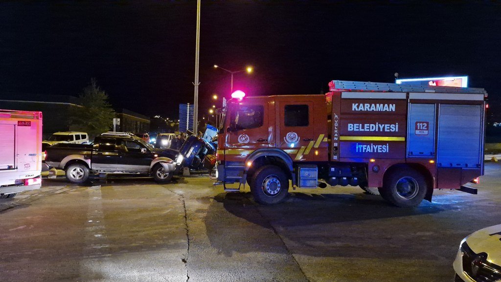 Kaza, akşam saat 22.50 sıralarında Yunuskent Mahallesi Zeytin Dalı Bulvarı üzerinde bulunan Valilik Kavşağı'nda meydana geldi. Edinilen bilgiye göre, H.K. (21) yönetimindeki 70 AF 952 plakalı Opel marka otomobil ile A.K. (27) idaresindeki 70 BG 783 plakalı Nissan marka kamyonet kavşakta çarpıştı. Kazada kamyonette bulunan A.S.A. (23) ile orta refüje devrilen otomobilin sürücüsü ile yanında bulunan Y.K. (21) araç içerisinde sıkışarak yaralandı. İhbar üzerine olay yerine sağlık, itfaiye ve polis ekipleri sevk edildi. Araç içerisinde sıkışan sürücü ile yolcu, itfaiye tarafından kurtarıldı. Yaralılar sağlık ekibinin olay yerinde yaptığı ilk müdahalenin ardından ambulanslarla Karaman Eğitim ve Araştırma Hastanesi'ne kaldırılarak tedavi altına alındı.