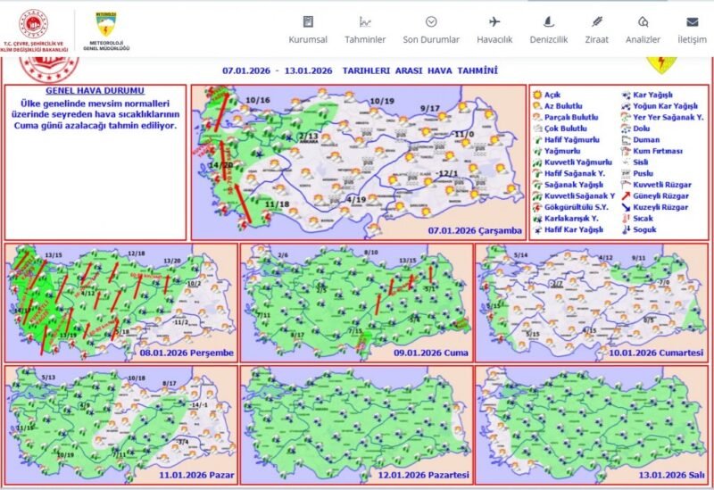 Meteoroloji Genel Müdürlüğü tarafından yapılan tahminlere göre: Ülkemiz genelinin parçalı ve çok bulutlu, Marmara, Ege, Batı Akdeniz, İç Anadolu'nun güney ve batısı, Batı Karadeniz'in batısı ile Kastamonu ve Mersin çevrelerinin yağmur ve sağanak yağışlı geçeceği tahmin ediliyor. Yağışların, Edirne ve Kırklareli ile Edremit Körfezi çevrelerinde yerel kuvvetli olması bekleniyor. İç ve doğu bölgelerde buzlanma ve don ile birlikte pus ve yer yer sis olayı bekleniyor. Doğu Karadeniz’in iç kesimlerinin yüksekleri ile Doğu Anadolu’nun doğusunda yüksek kar örtüsüne sahip eğimli kesimlerinde çığ tehlikesi bulunmaktadır.