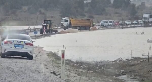 Olay yerine gelen Karayolları ekipleri, suyun yola yayılmasını önlemek amacıyla kumla bariyer oluşturmaya çalışıyor. Ekiplerin müdahalesi sürerken, bölgede araç geçişine izin verilmiyor.