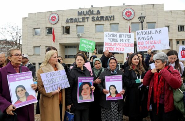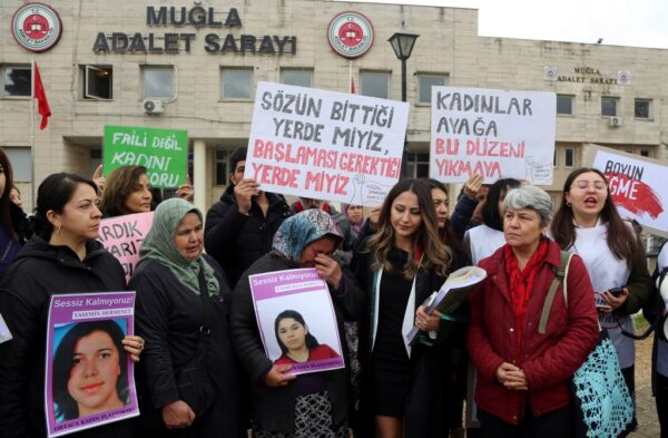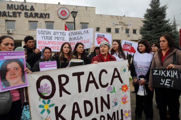 Öte yandan, bazı kadın dernekleri de adliye önünde pankart açarak kadın cinayetlerini protesto etti.
