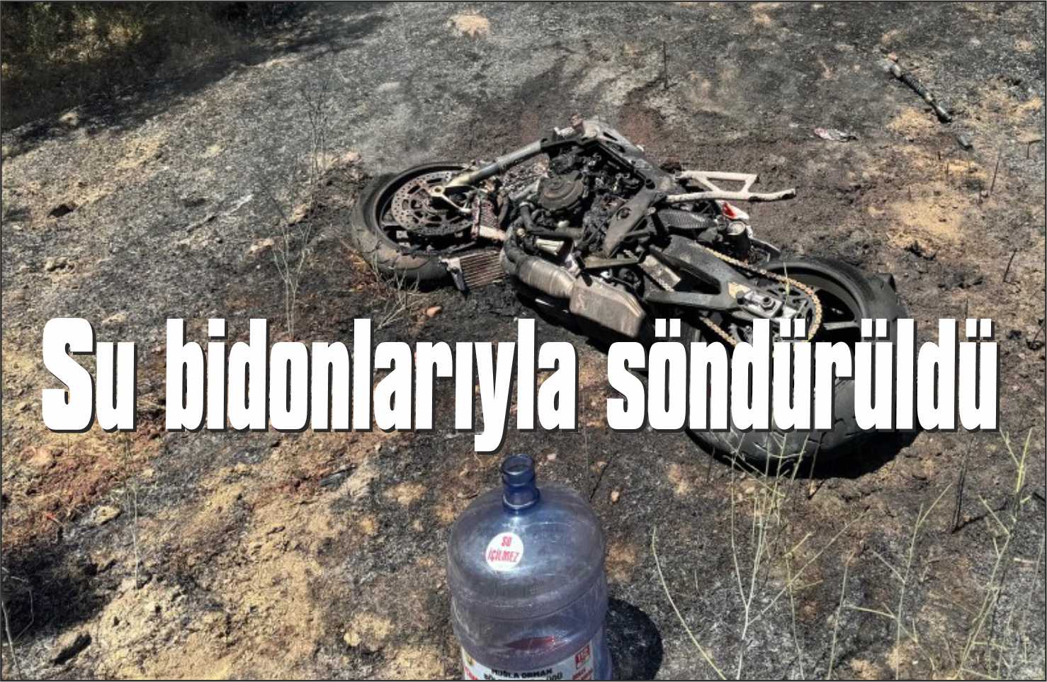 Aydın'ın Çine ilçesinde meydana gelen kaza sonrasında alev alan motosiklet sebebiyle yol kenarında başlayan yangın, yol kenarlarına bırakılan su bidonları sayesinde büyümeden söndürüldü.