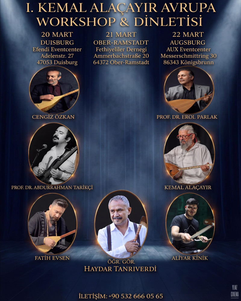 Almanya’da, Duisburg, Ober-Ramstadt ve Augsburg’ta ilki yapılacak olan 1. Kemal Alaçayır Avrupa Workshop&Konser etkinliği duyurulmaya başladığı andan itibaren büyük ilgi ile karşılandı. İlk organizasyonundan bu yana, beraber yola çıktığı hocalarla yoluna devam eden Kemal Alaçayır, Almanya’da yapılacak olan organizasyonda Cengiz Özkan, Prof. Dr. Erol Parlak, Öğrt. Gör. Dr. Haydar Tanrıverdi, Prof. Dr. Abdurrahman Tarıkçı, Doç. Dr. Aliyar Kınık ve Dr. Fatih Evsen gibi müziğin kıymetli isimleriyle sahnede olacak.