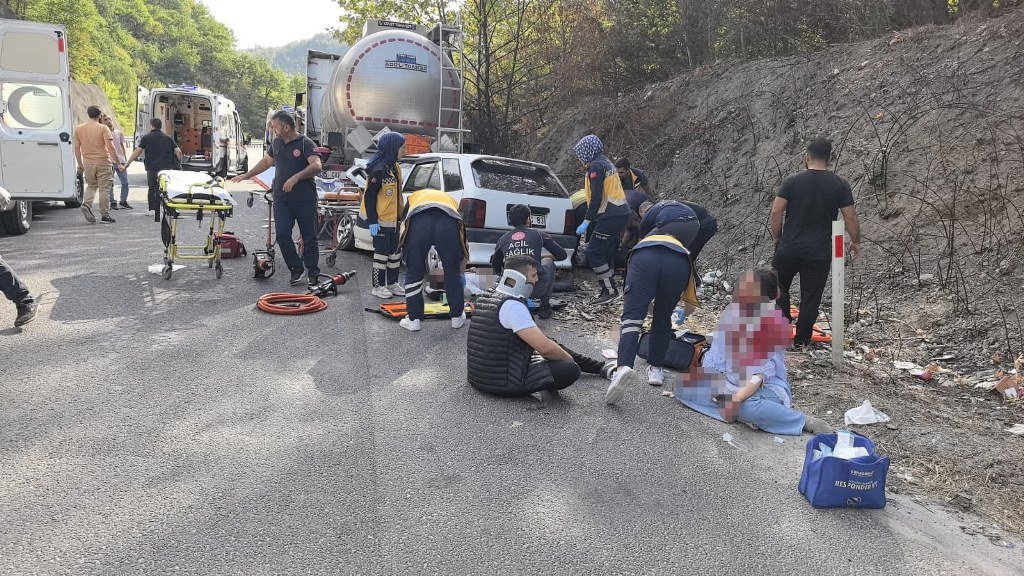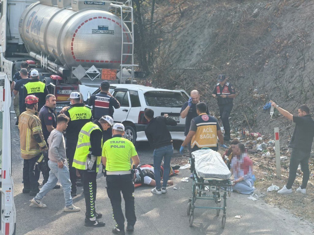 Bursa'nın İnegöl ilçesinde meydana gelen kazada kontrolden çıkan otomobil park halindeki asit yüklü tankere çarptı; 1'i bebek 5 kişi yaralandı.