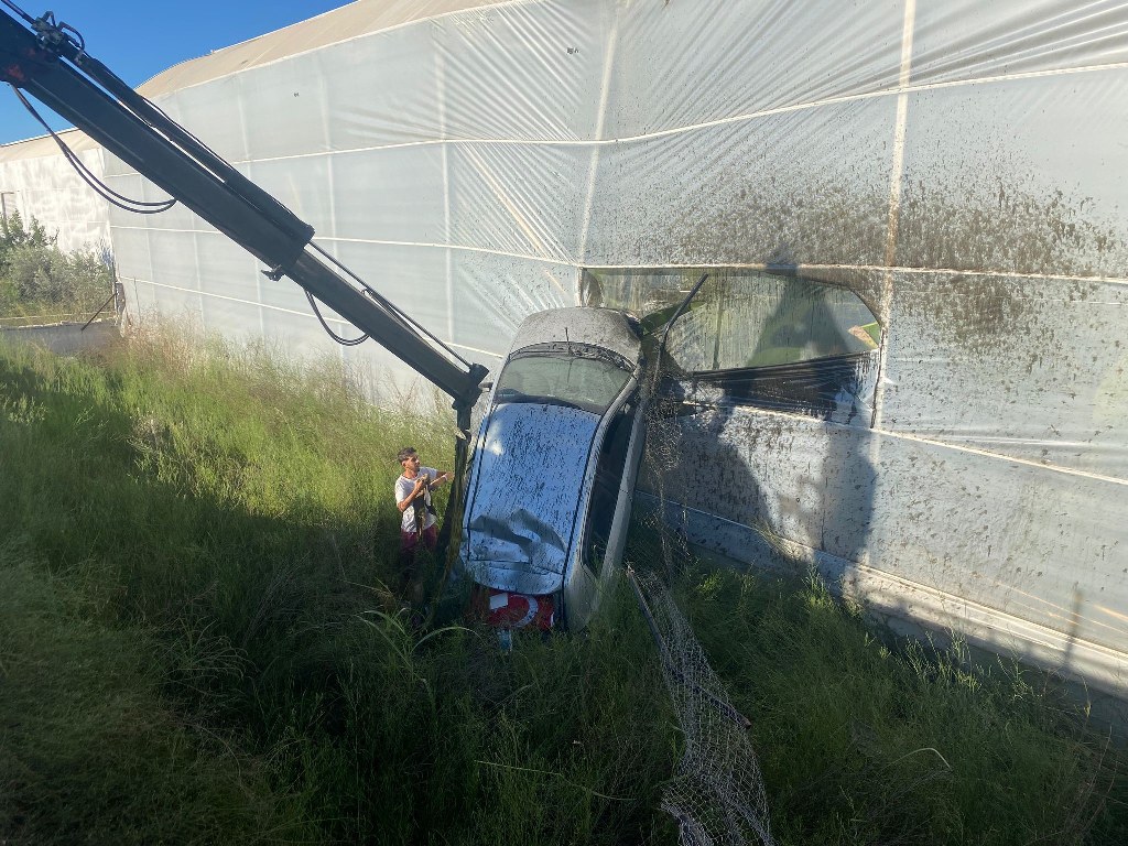 Antalya’nın Serik ilçesinde direksiyon hâkimiyetini kaybeden sürücü, otomobiliyle yoldan çıkarak yol kenarındaki muz serasına girdi. Yaralanan sürücü hastaneye götürüldü.