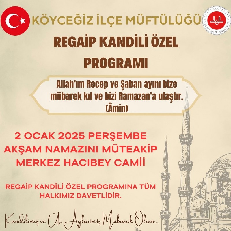 Regaip Kandili dolayısıyla Köyceğiz İlçe Müftülüğü tarafından Perşembe günü öğleden önce saat 11.00’da Köyceğiz Merkez Hacılar Yunus Emre Camii ile Köyceğiz Toparlar Mahallesi Merkez Camii'nde kadınlara yönelik kandil özel programı yapılacak. Akşam namazından sonra da tüm camilerde olduğu gibi Merkez Hacıbey Camii'nde 'Kandil Özel' programı yapılacak. Programlara tüm vatandaşlar davet edildi.