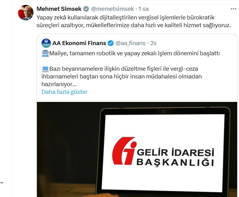 Sosyal medyadan bir paylaşımda bunulan Bakan Şimşek, “Yapay zekâ kullanılarak dijitalleştirilen vergisel işlemlerle bürokratik süreçleri azaltıyor, mükelleflerimize daha hızlı ve kaliteli hizmet sağlıyoruz.” dedi.