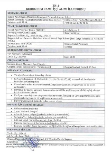 Söz konusu ilan, Marmaris Belediyesi Personel AŞ tarafından kurum dışı kamu işçi alımı kapsamında yayımlanmış, 1 veteriner hekim alımı yapılacağı, pozisyonun daimi ve tam zamanlı olduğu ilan metninde açıkça belirtilmişti. Başvuruların Marmaris'te şahsen alınacağı ve görüşmenin 27 Aralık'ta yapılacağı bilgisi de İŞKUR sisteminde yer almıştı./İHA