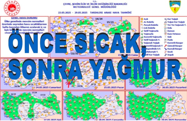 Meteoroloji Genel Müdürlüğü 1 haftalık hava tahmin raporunu güncelledi. 25 Mayıs Pazar günü batıdan başlayacak yağışı havanın özellikle yurdumuzun batı bölgelerinde 29 Mayıs Perşembe gününe kadar devam etmesi tahmin ediliyor.