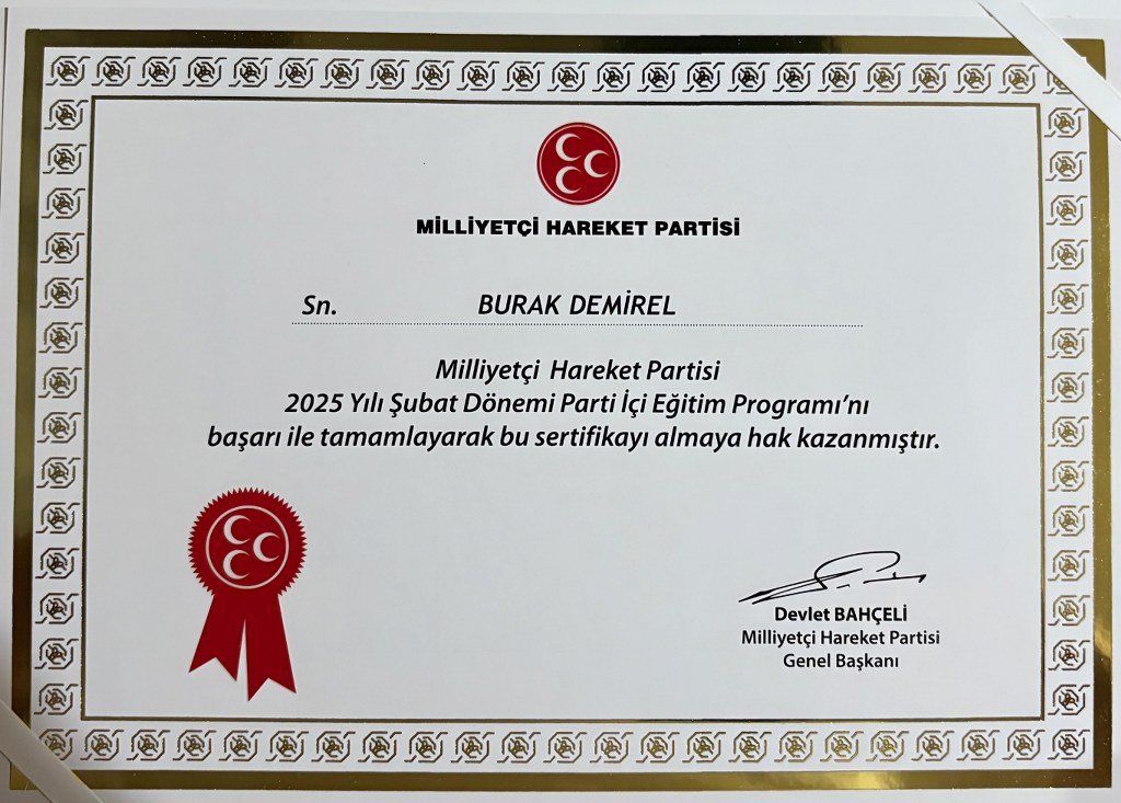 MHP Muğla İl Başkanlığı İl Başkanı Burak Demirel önderliğinde il yönetimi ve ilçe başkanlarının katılımıyla Genel Merkez'deki eğitim programını tamamlayarak sertifika aldı.