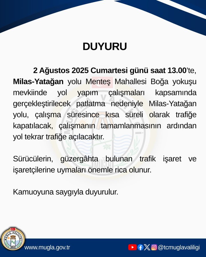 Muğla Valiliği’nden yapılan bilgilendirme şöyle: “2 Ağustos 2025 Cumartesi günü saat 13.00’te, Milas-Yatağan yolu Menteş Mahallesi Boğa yokuşu mevkiinde yol yapım çalışmaları kapsamında gerçekleştirilecek patlatma nedeniyle Milas-Yatağan yolu, çalışma süresince kısa süreli olarak trafiğe kapatılacak, çalışmanın tamamlanmasının ardından yol tekrar trafiğe açılacaktır.