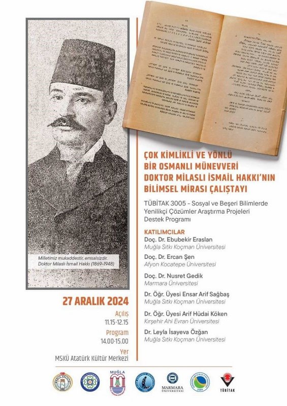 MSKÜ’den yapılan açıklamada, “Muğla Sıtkı Koçman Üniversitesi Atatürk Kültür Merkezi’nde 27.12.2024 tarihinde “Çok Kimlikli ve Yönlü Bir Osmanlı Münevveri Doktor Milaslı İsmail Hakkı'nın Bilimsel Mirası Çalıştayı” düzenlenecektir. Halk sağlığının korunması için başarılı çalışmalar yapmış; bilhassa Anadolu’da salgın hastalıklarla mücadelede önemli görevler üstlenmiş 19. yüzyıl bilim insanı olan Doktor İsmail Hakkı Milaslı üzerine gerçekleştirilecek Çalıştay’da, Milaslının bilimsel mirası ortaya konacaktır. Çalıştayımıza siz değerli basın mensuplarını da bekler; iyi çalışmalar dileriz” denildi.(İHA)